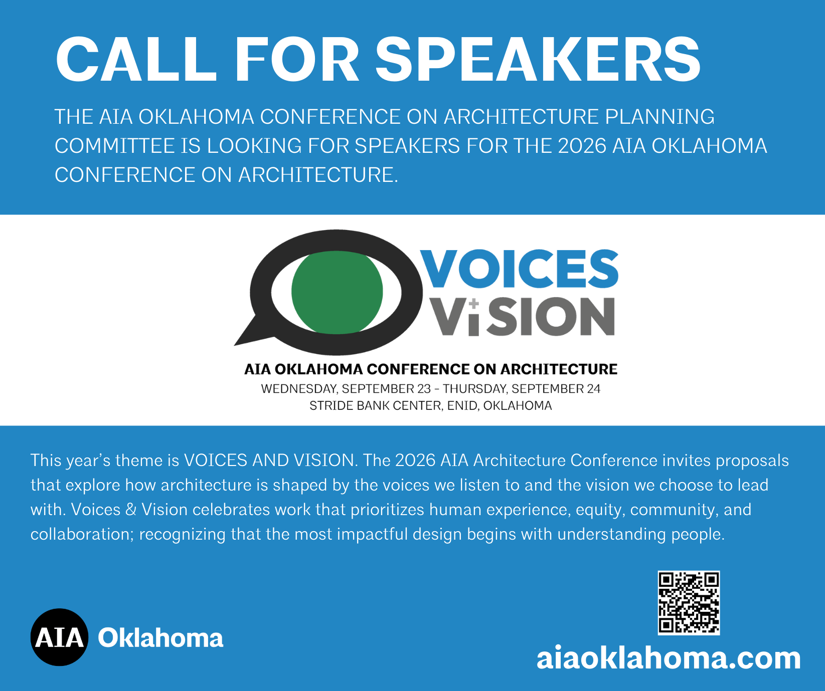 The AIA Oklahoma Conference Committee is looking for speakers for this year’s AIA Oklahoma Conference on Architecture.